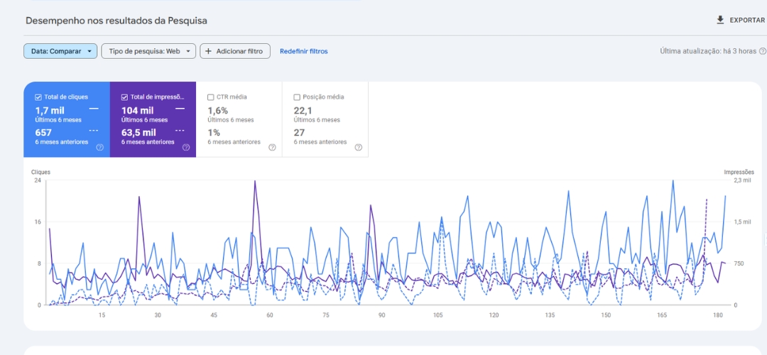 O desempenho no Google Search Console (últimos 6 meses vs. 6 meses anteriores), os números mostram o impacto real: